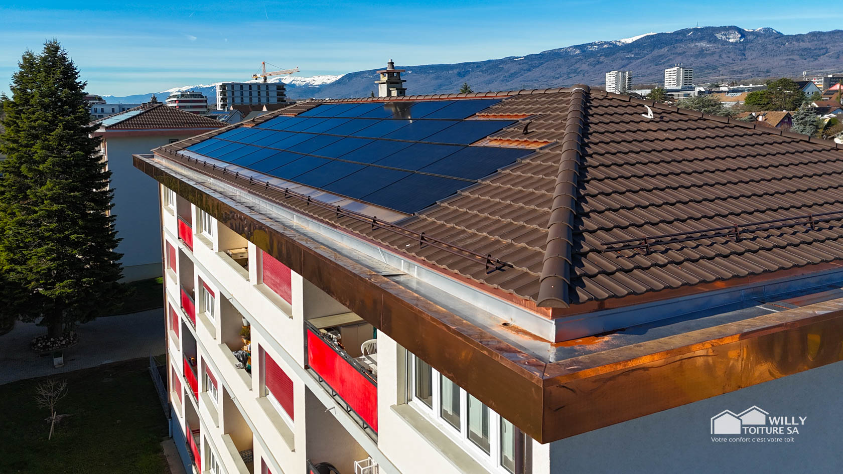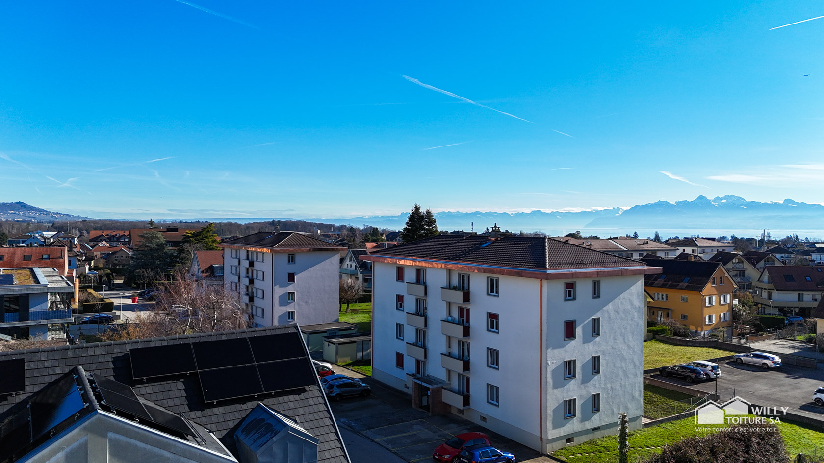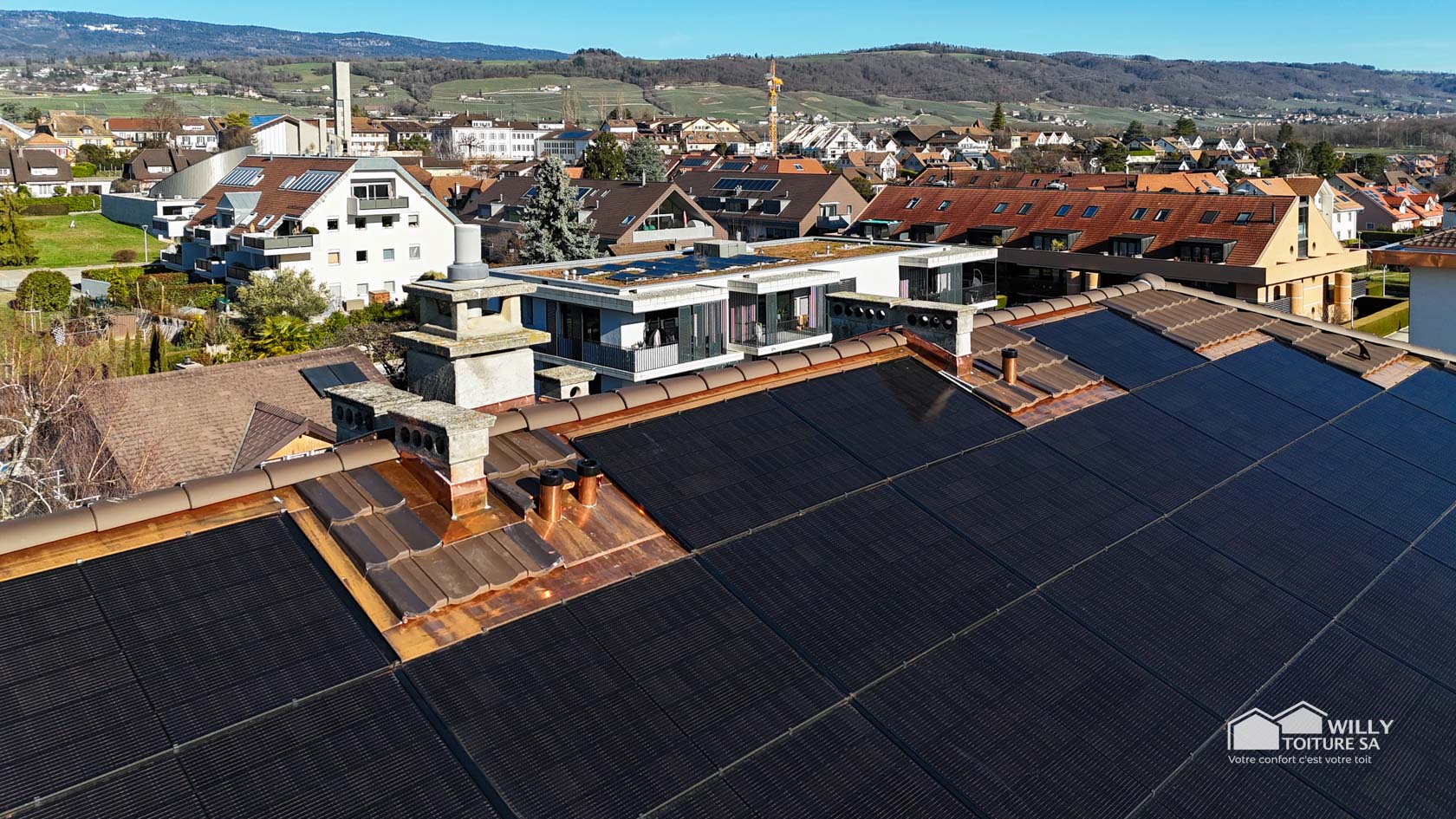 Dans le cadre de la rénovation d’immeubles locatifs à Gland (VD), nous avons réalisé une réfection complète de la toiture, comprenant la sous-couverture, l’isolation, la ferblanterie ainsi que l’installation d’un système photovoltaïque. L’intervention a permis d’améliorer durablement la performance énergétique du bâtiment tout en assurant une protection optimale contre les intempéries.