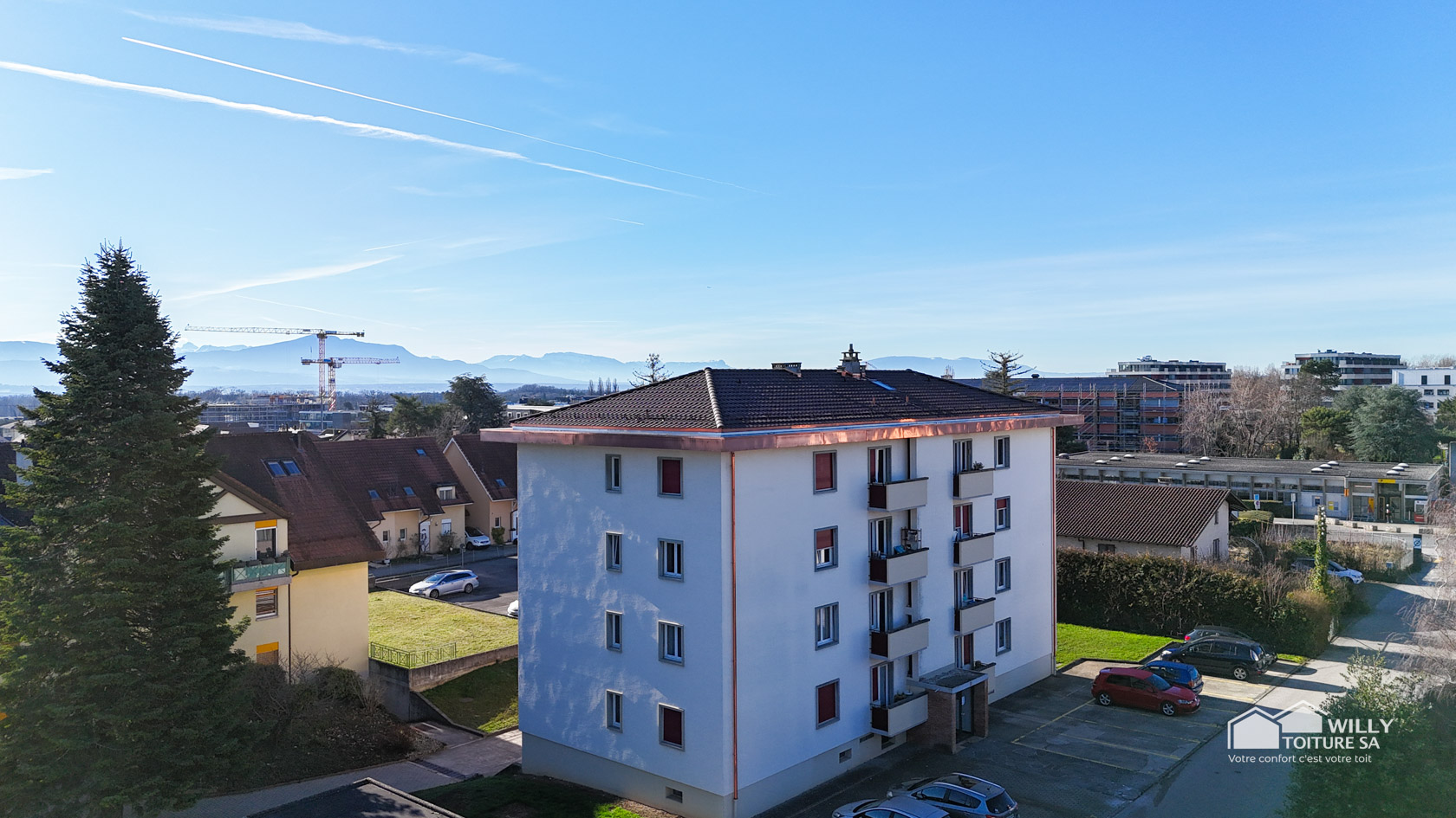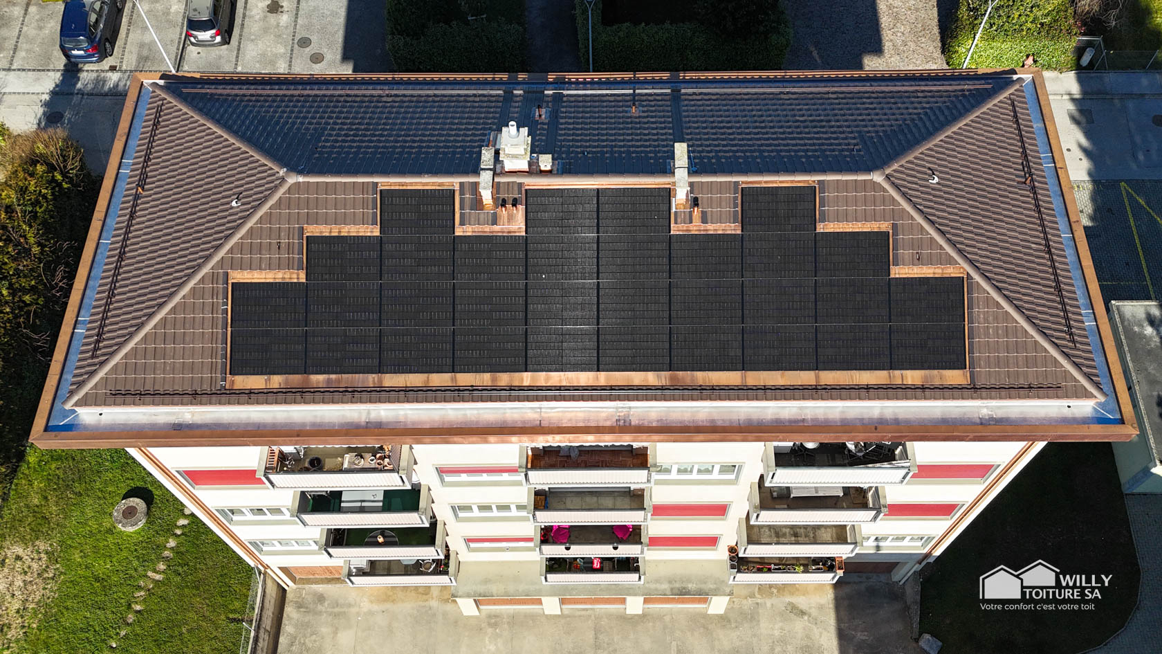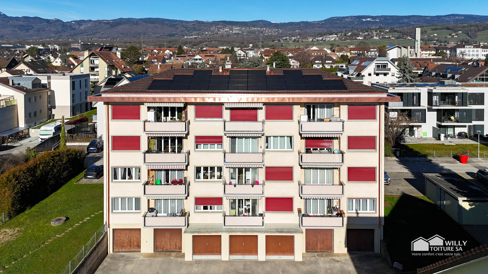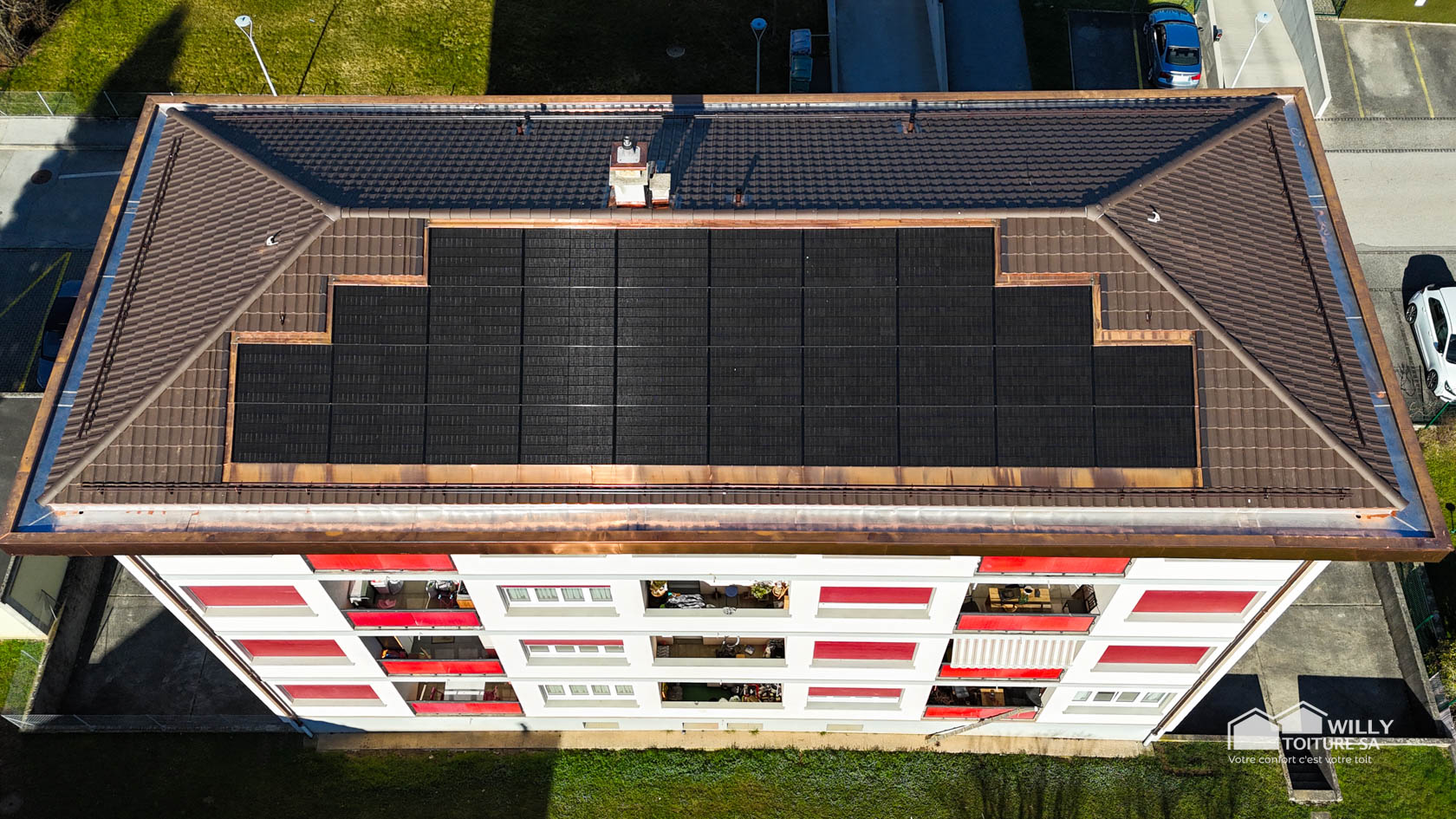 Dans le cadre de la rénovation d’immeubles locatifs à Gland (VD), nous avons réalisé une réfection complète de la toiture, comprenant la sous-couverture, l’isolation, la ferblanterie ainsi que l’installation d’un système photovoltaïque. L’intervention a permis d’améliorer durablement la performance énergétique du bâtiment tout en assurant une protection optimale contre les intempéries.