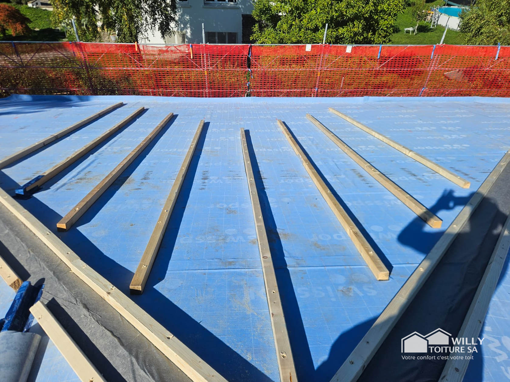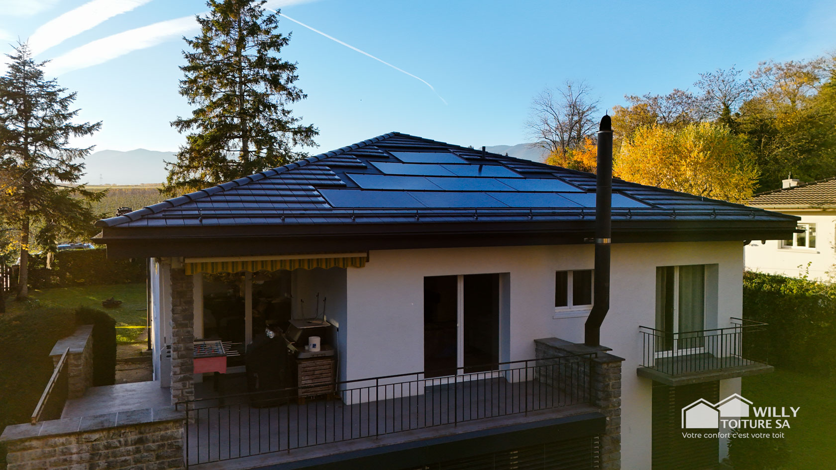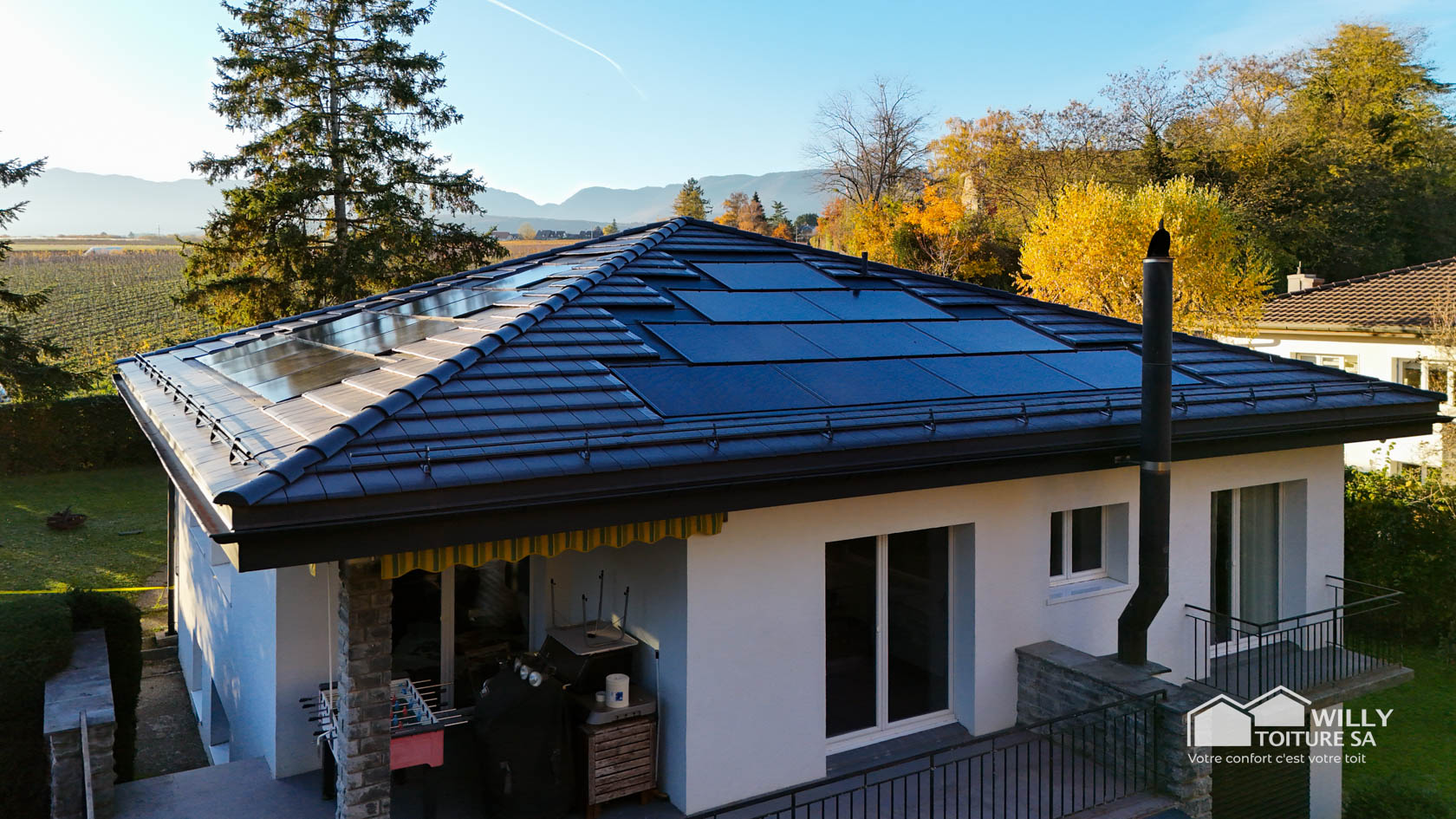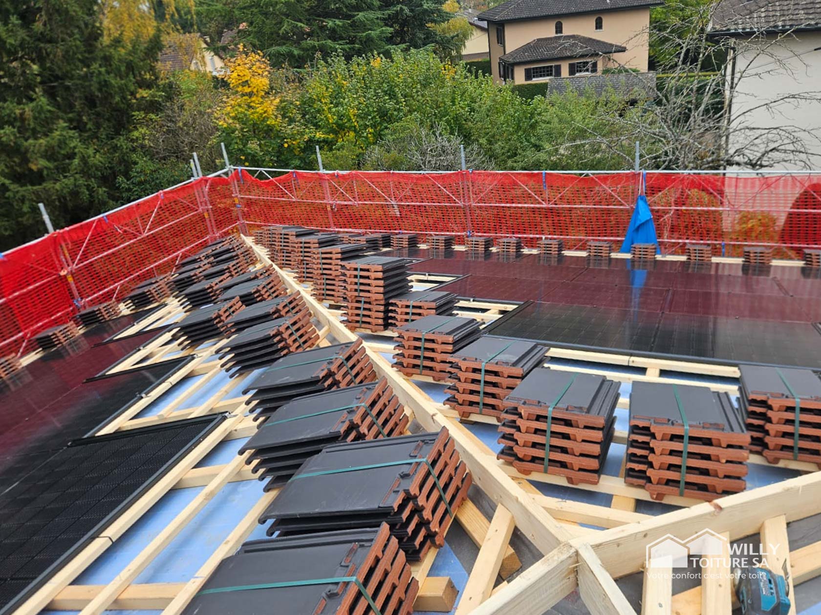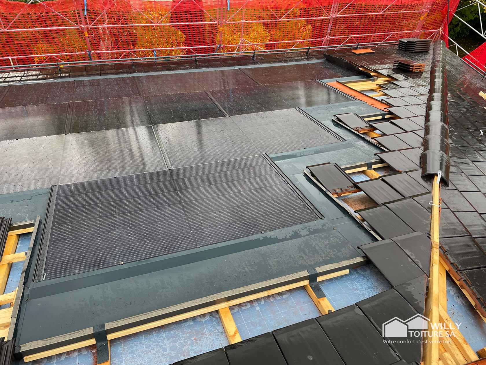 Rénovation énergétique d’une villa sise à Founex datant de 1966. Rénovation complète du toit qui était isolé entre chevrons. Une nouvelle isolation de type Swisspor sur chevrons d’une épaisseur de 140 mm a été installée à la place. De nouvelles tuiles plates mécaniques de couleur anthracite sont venues moderniser l’ensemble avec également des ferblanteries en alu anthracite.