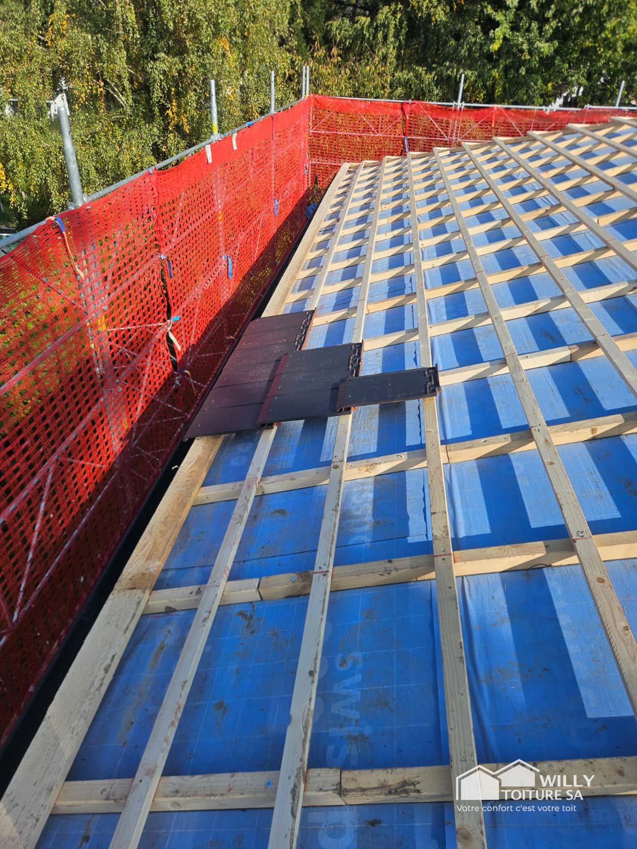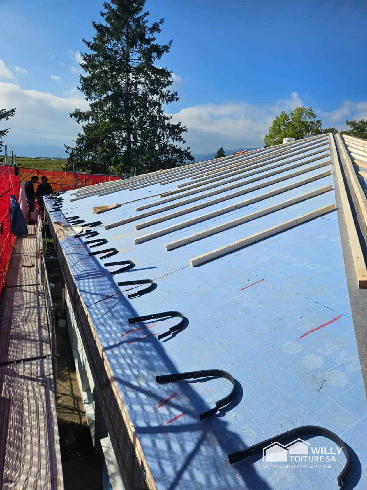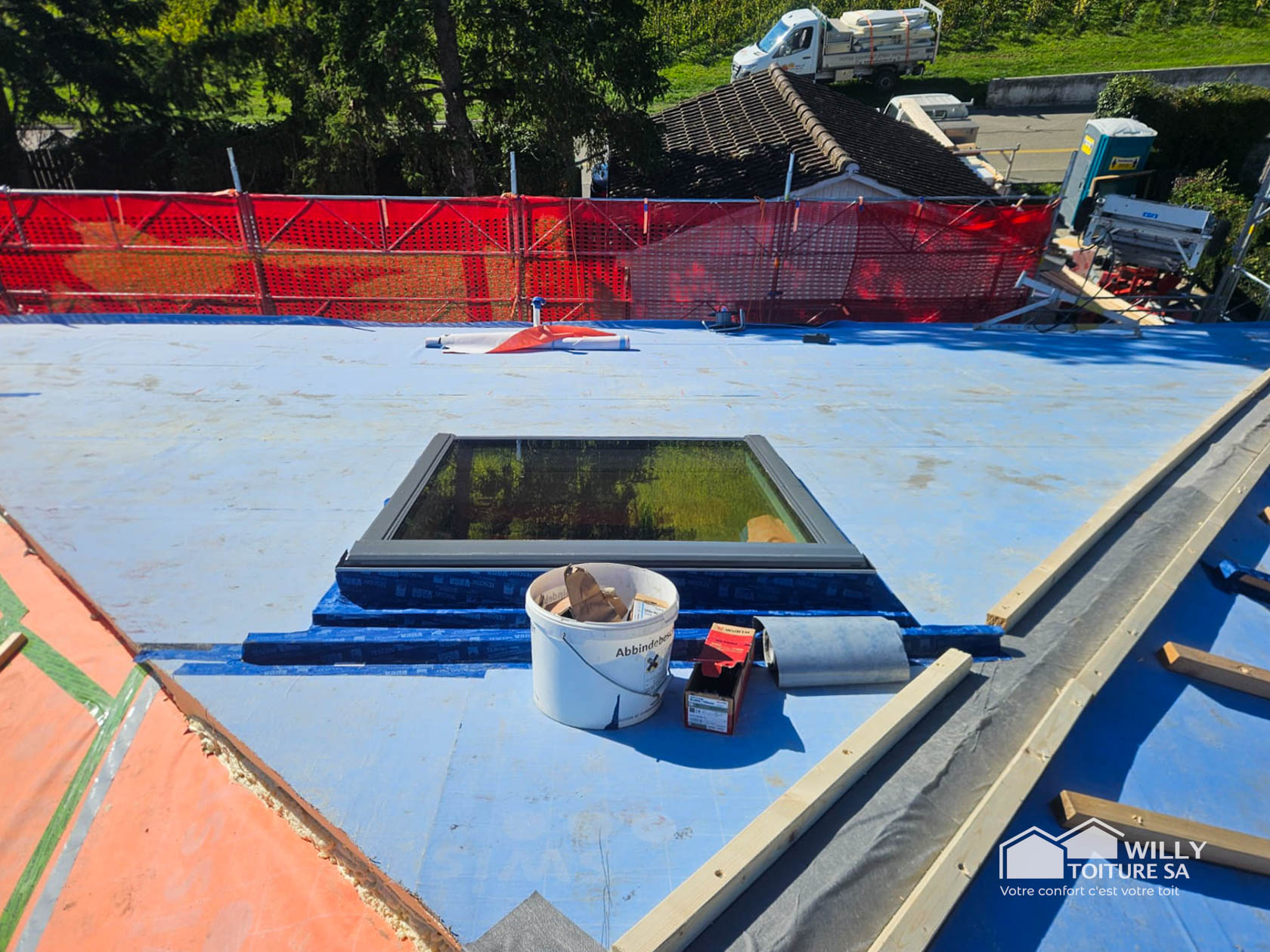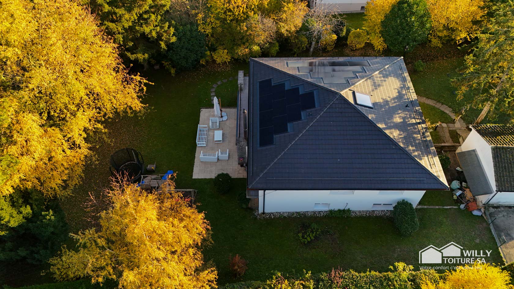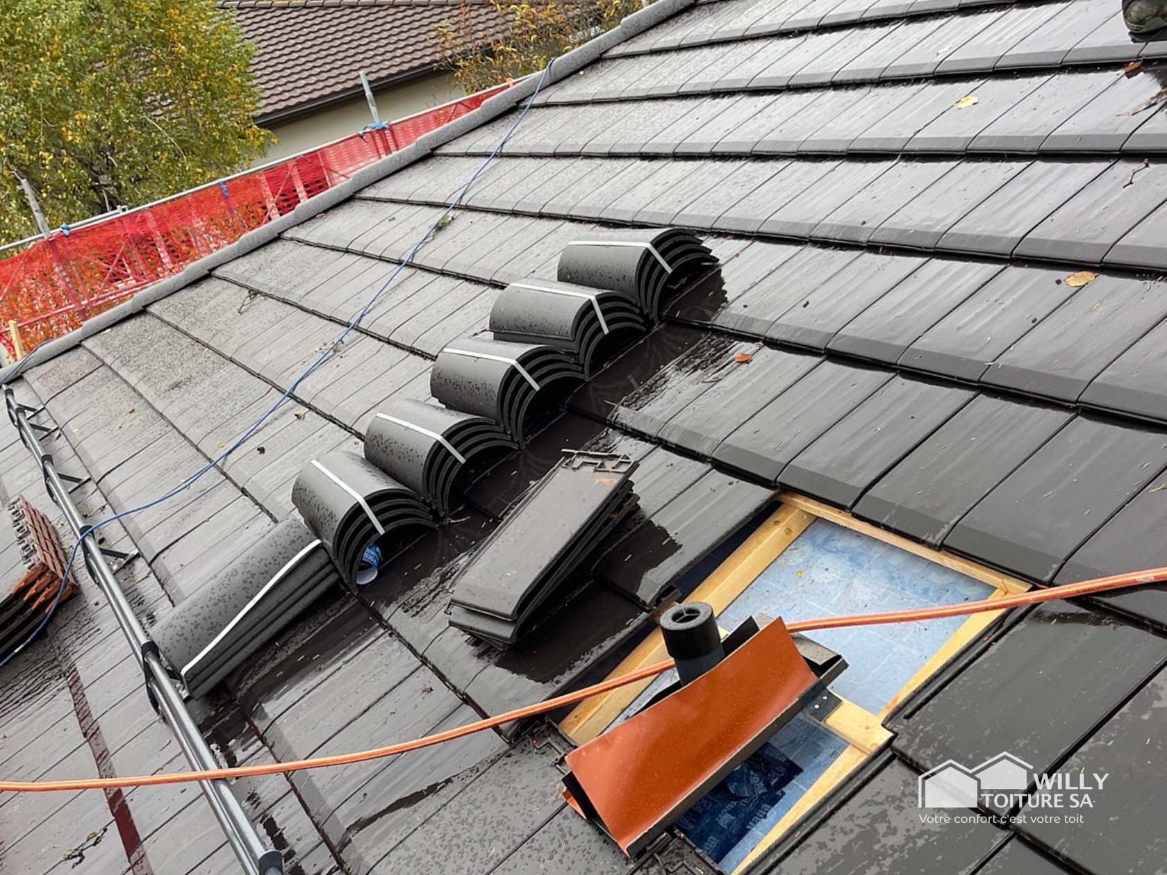 Rénovation énergétique d’une villa sise à Founex datant de 1966. Rénovation complète du toit qui était isolé entre chevrons. Une nouvelle isolation de type Swisspor sur chevrons d’une épaisseur de 140 mm a été installée à la place. De nouvelles tuiles plates mécaniques de couleur anthracite sont venues moderniser l’ensemble avec également des ferblanteries en alu anthracite.
