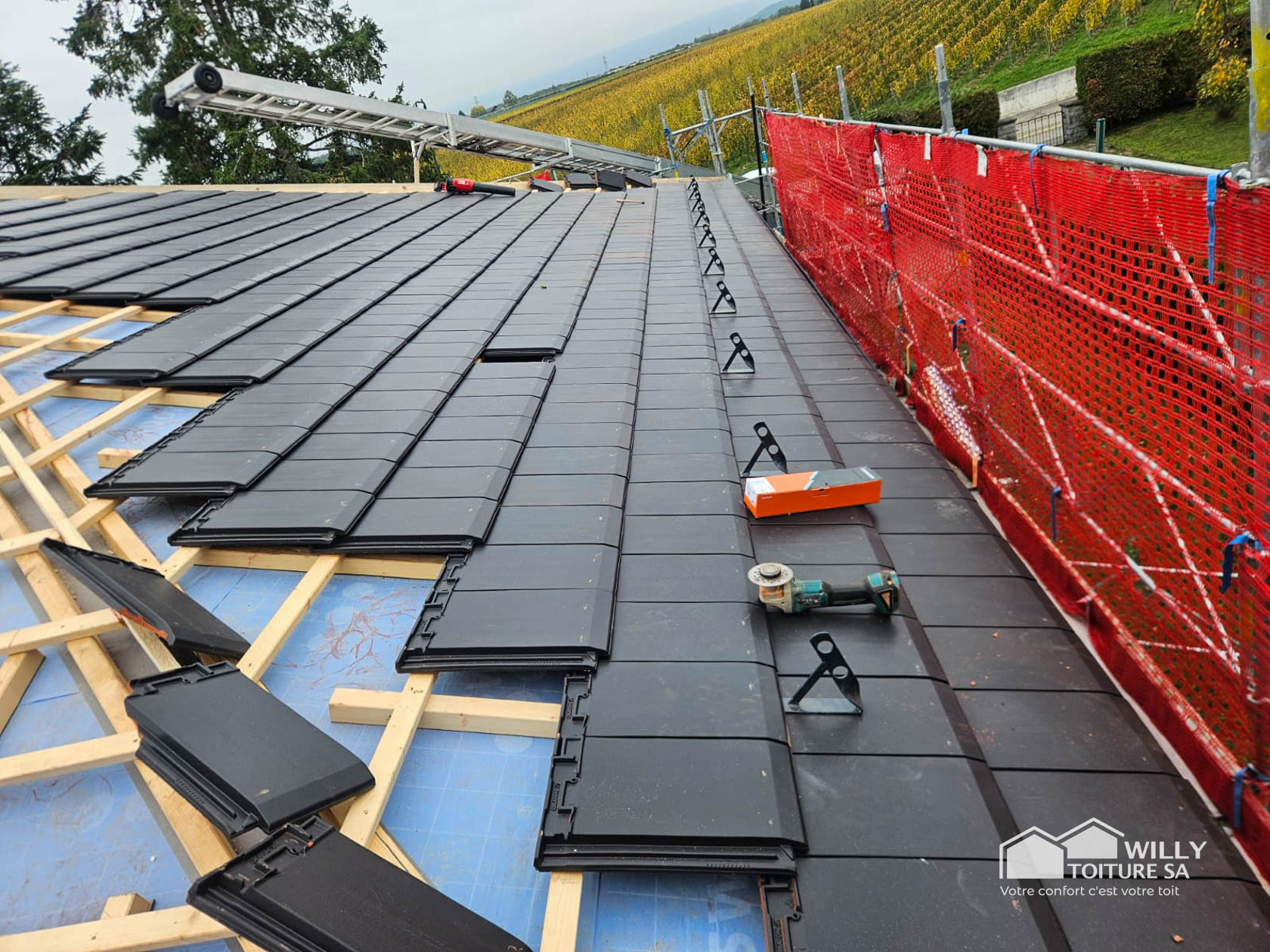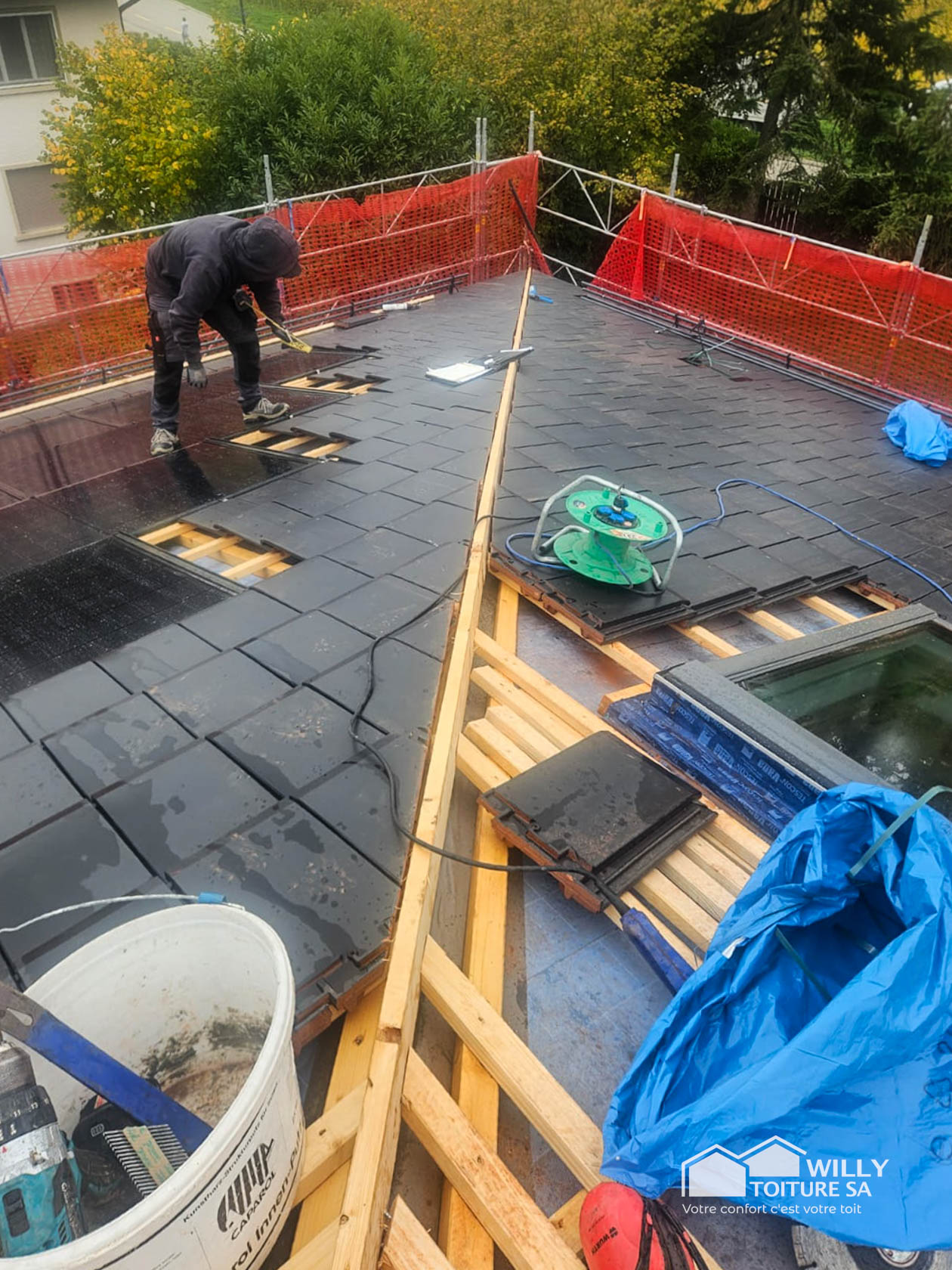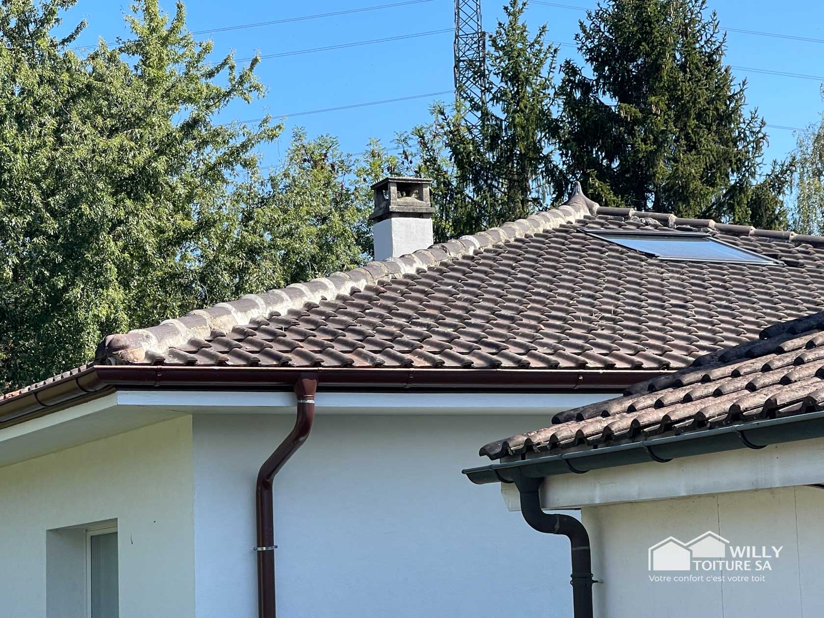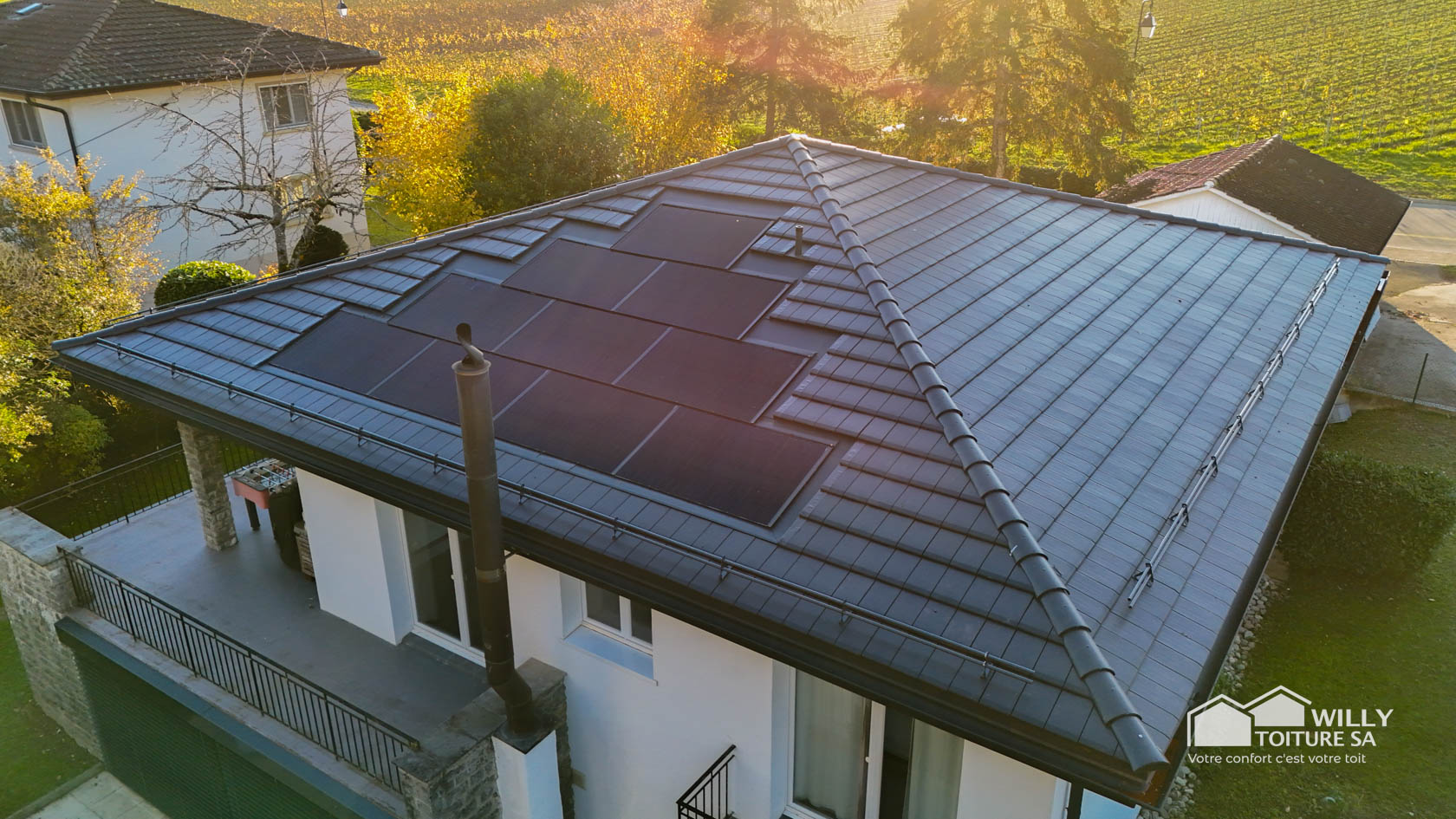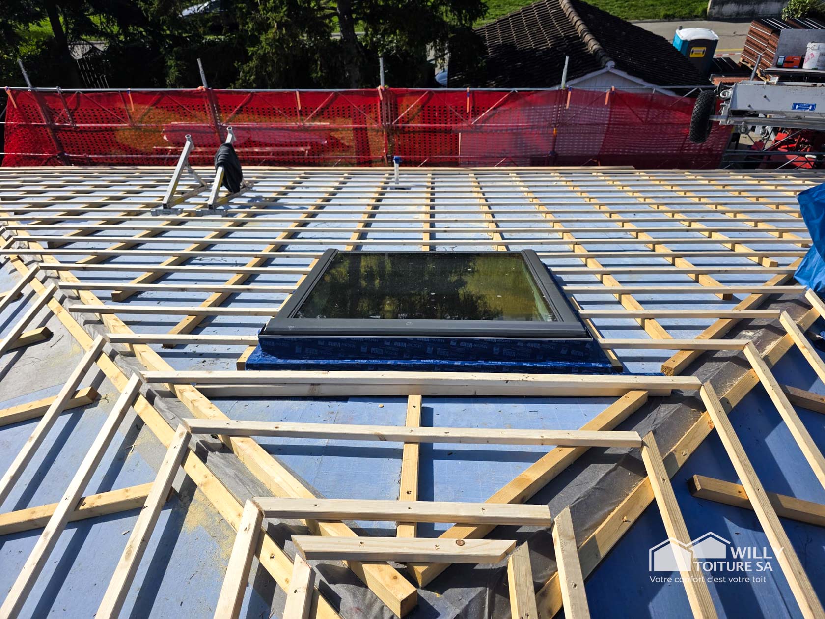 Rénovation énergétique d’une villa sise à Founex datant de 1966. Rénovation complète du toit qui était isolé entre chevrons. Une nouvelle isolation de type Swisspor sur chevrons d’une épaisseur de 140 mm a été installée à la place. De nouvelles tuiles plates mécaniques de couleur anthracite sont venues moderniser l’ensemble avec également des ferblanteries en alu anthracite.