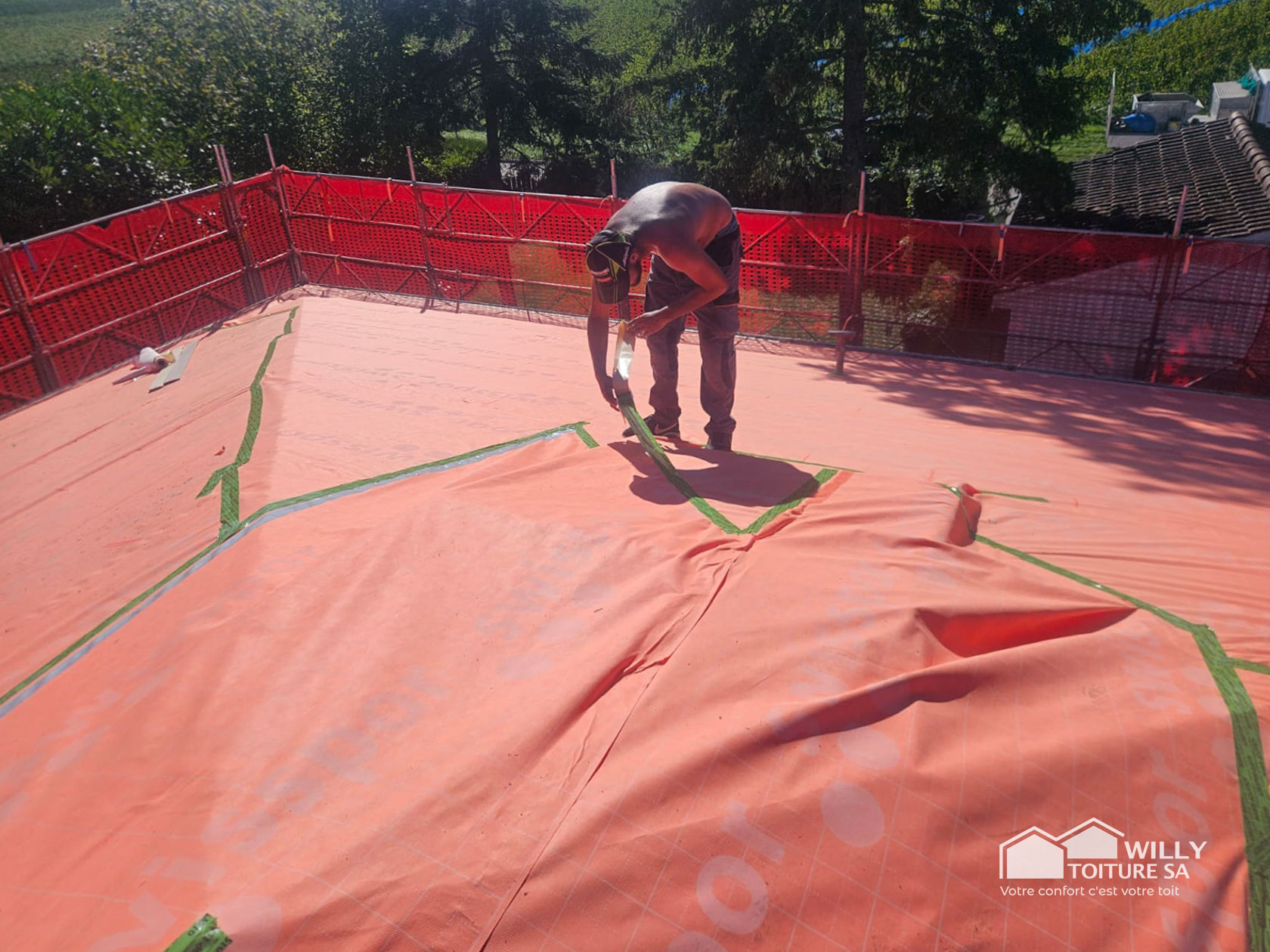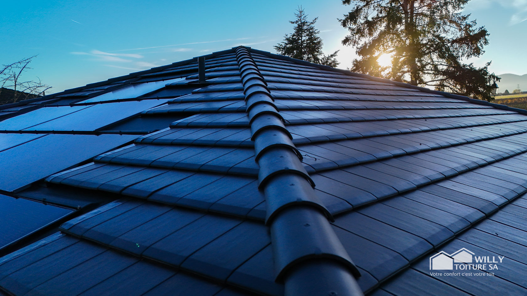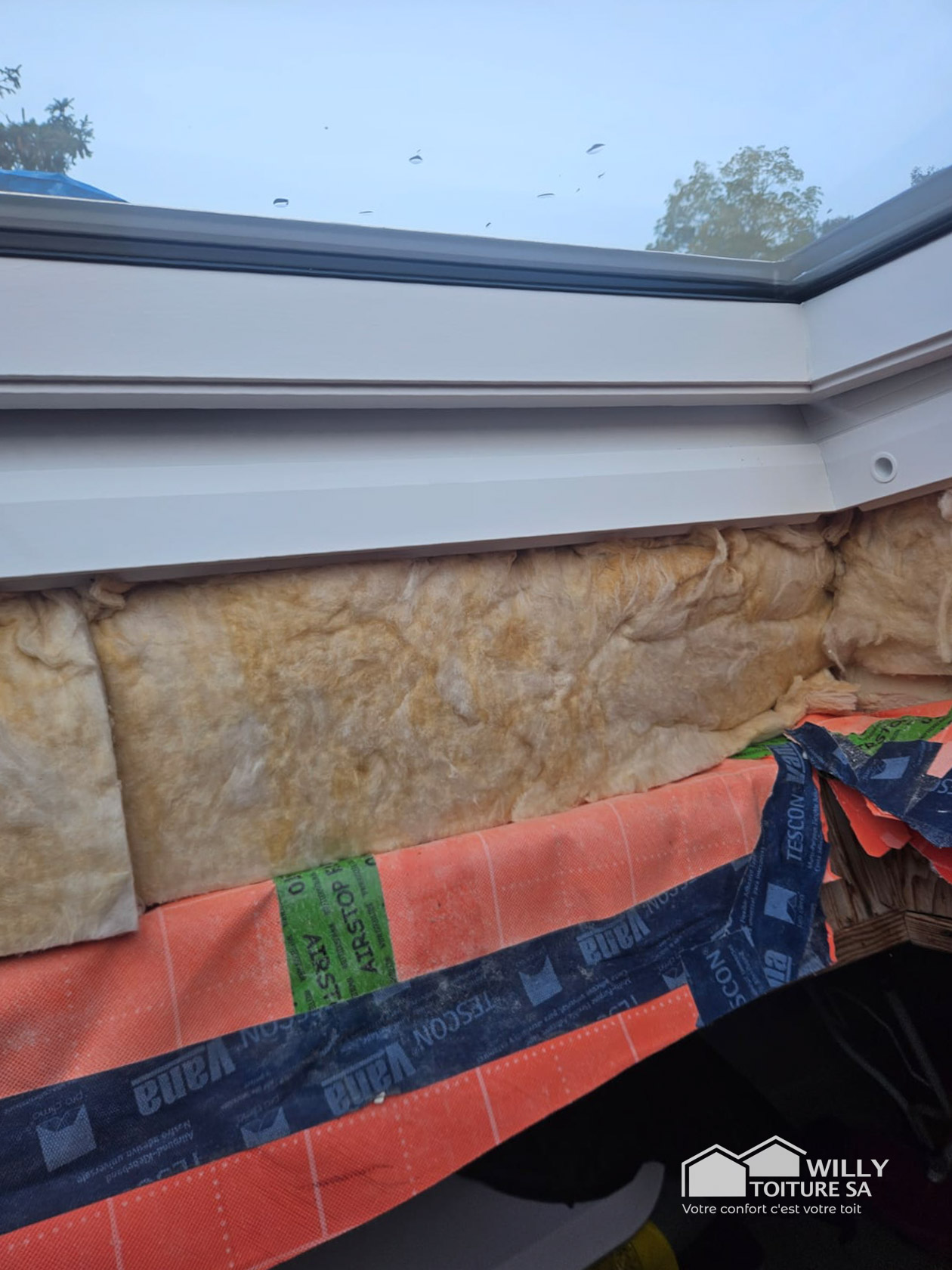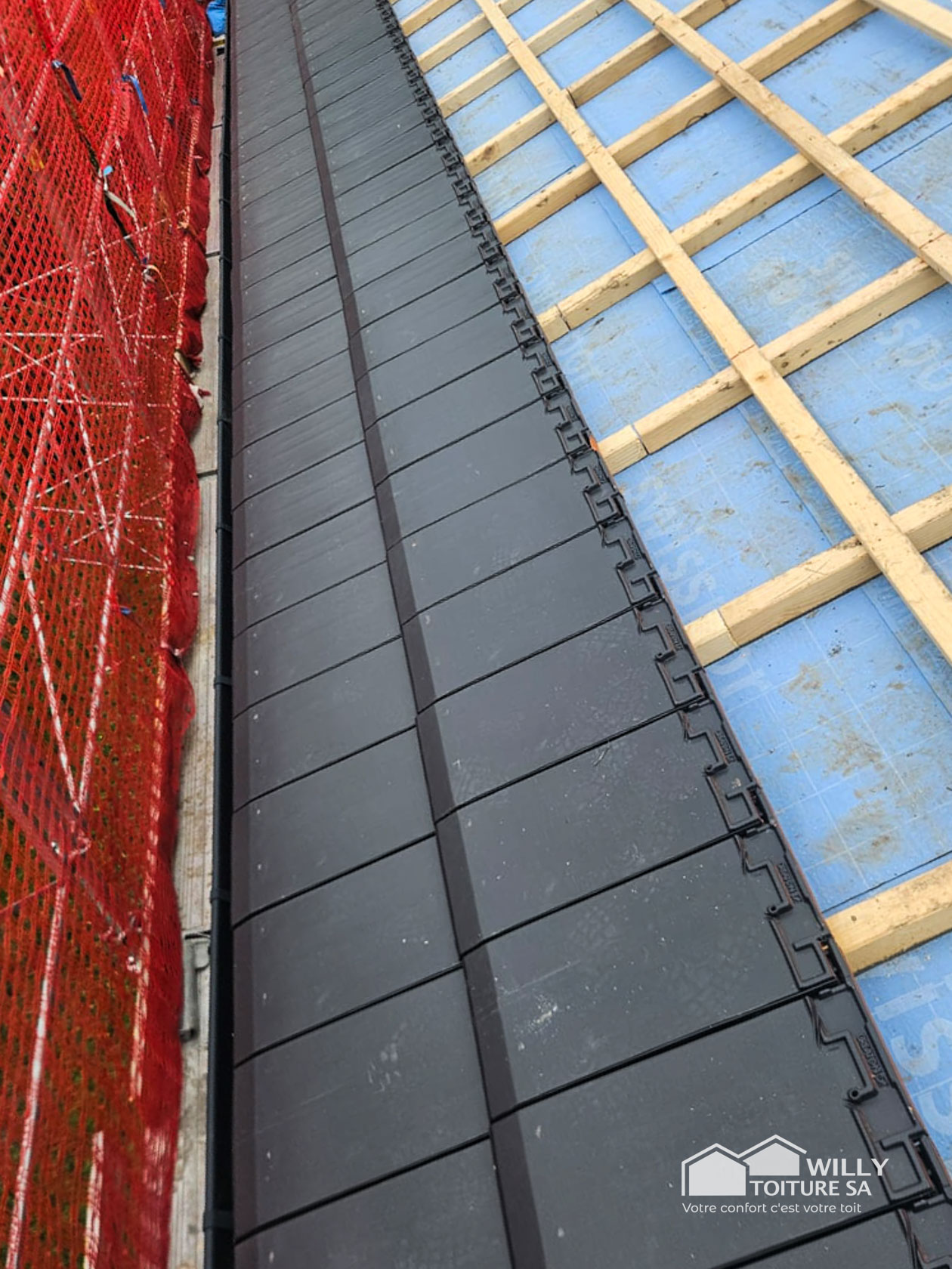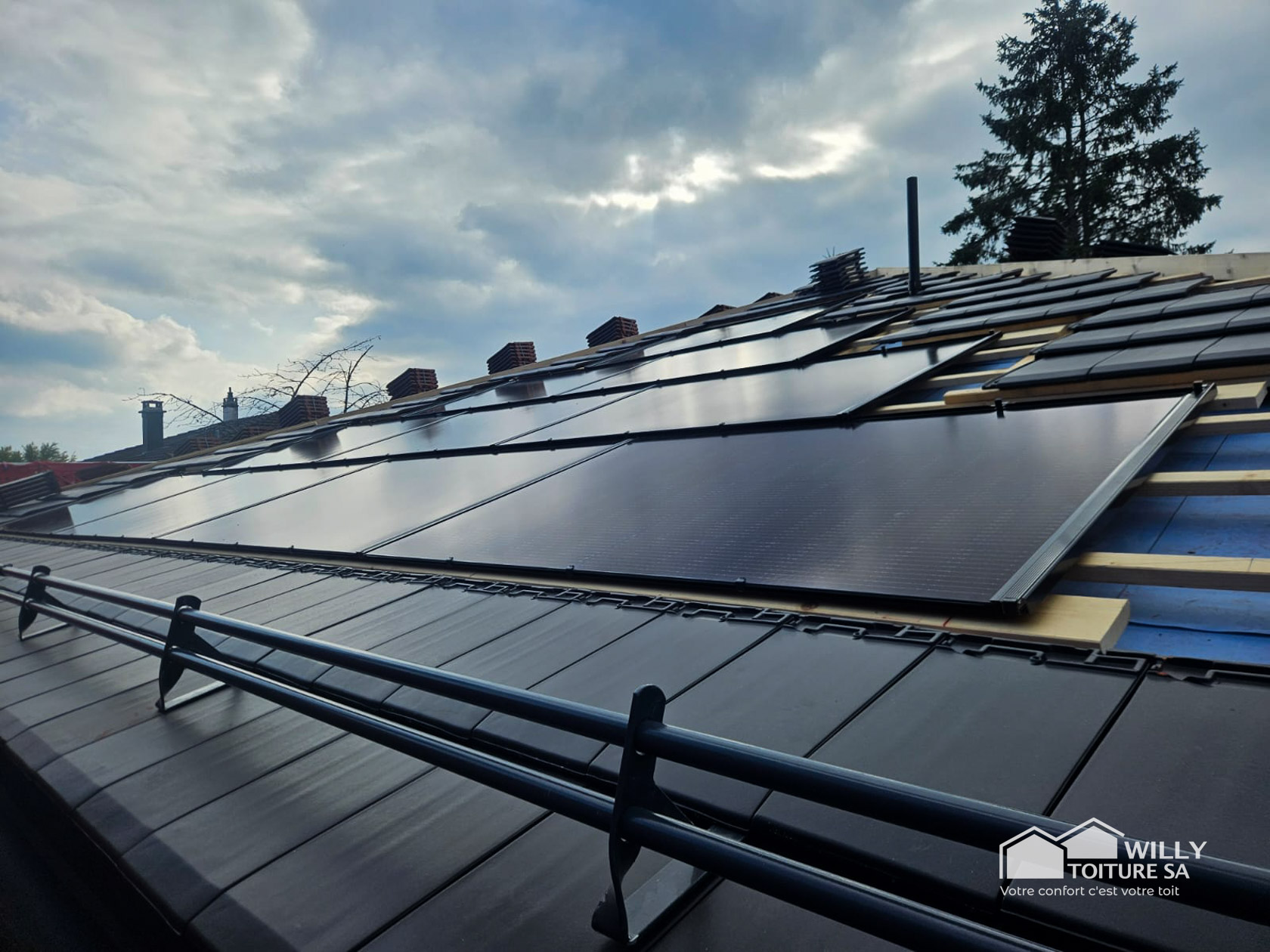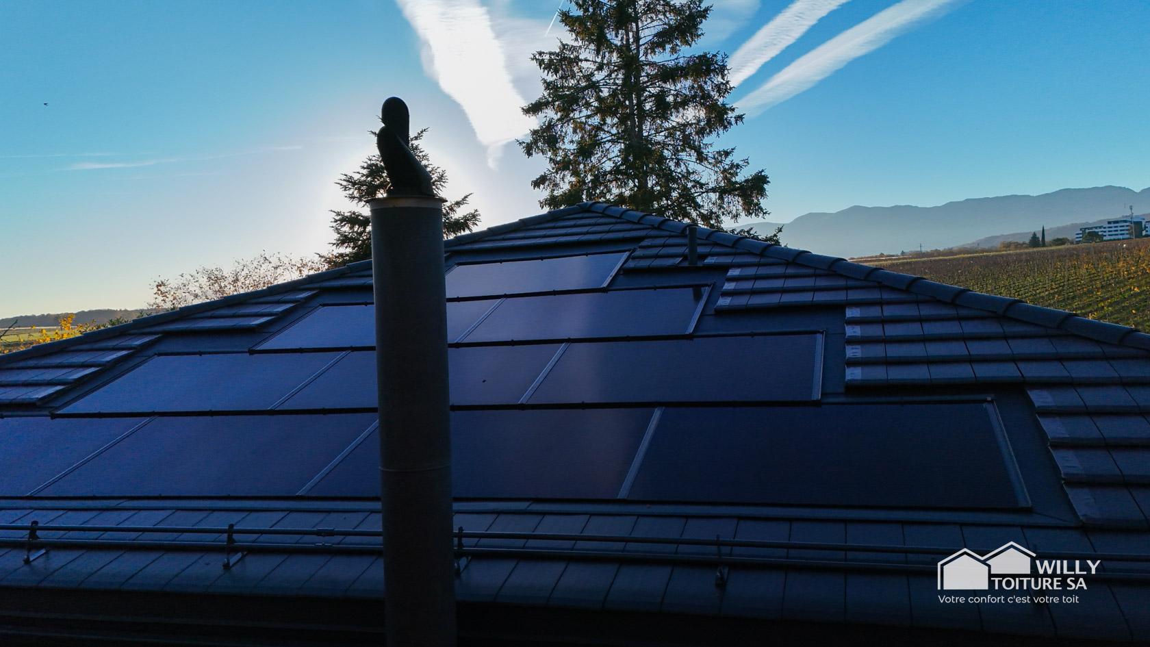 Rénovation énergétique d’une villa sise à Founex datant de 1966. Rénovation complète du toit qui était isolé entre chevrons. Une nouvelle isolation de type Swisspor sur chevrons d’une épaisseur de 140 mm a été installée à la place. De nouvelles tuiles plates mécaniques de couleur anthracite sont venues moderniser l’ensemble avec également des ferblanteries en alu anthracite.