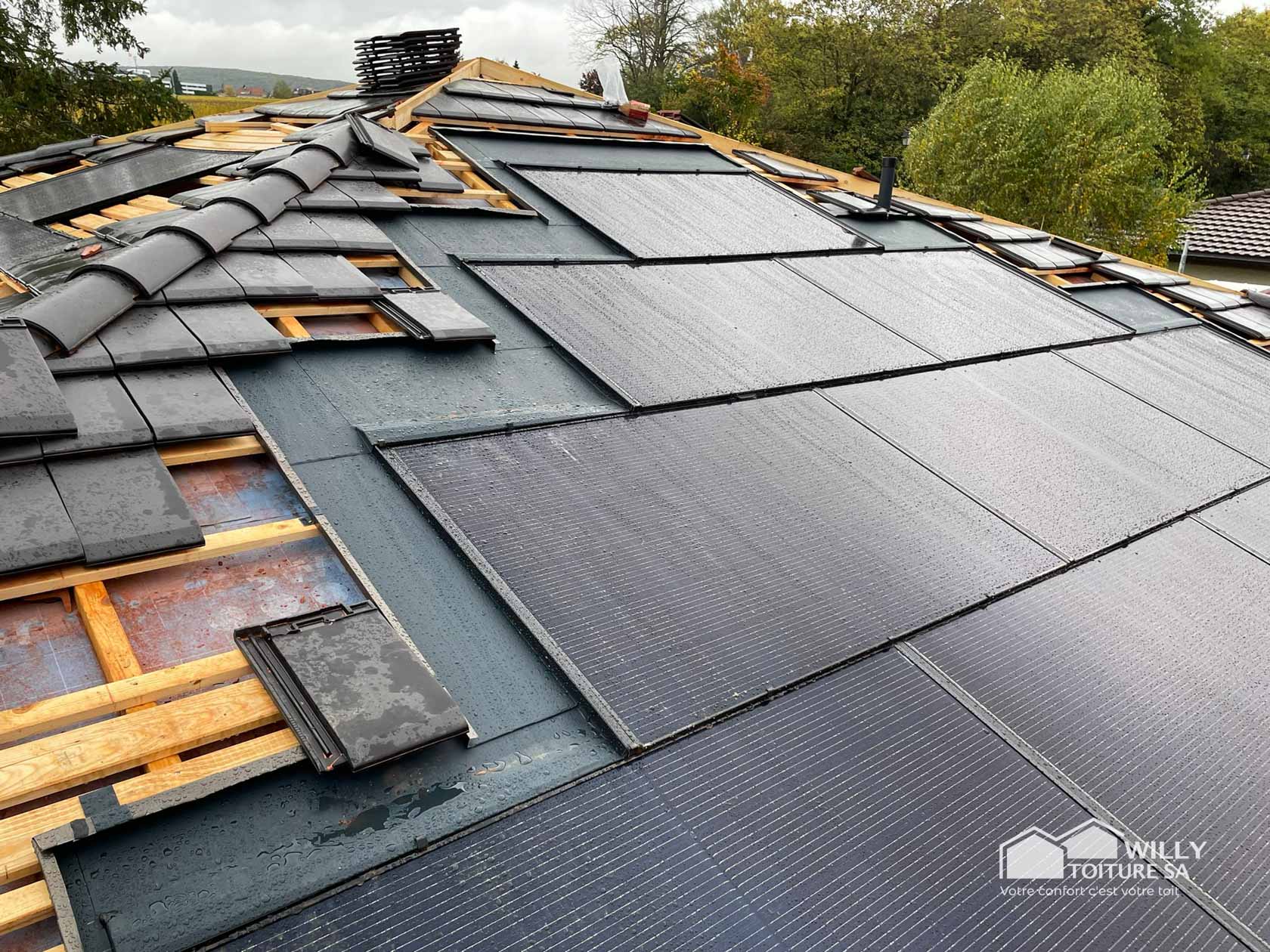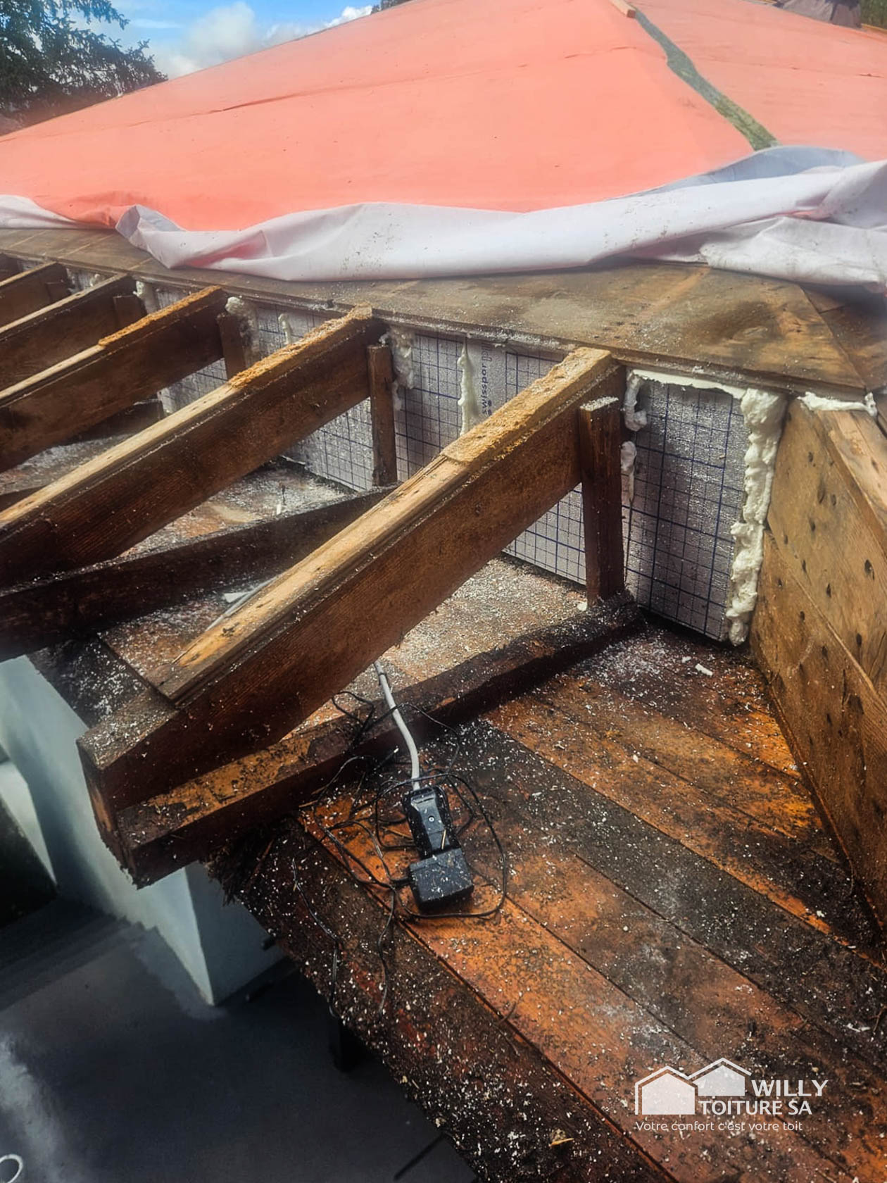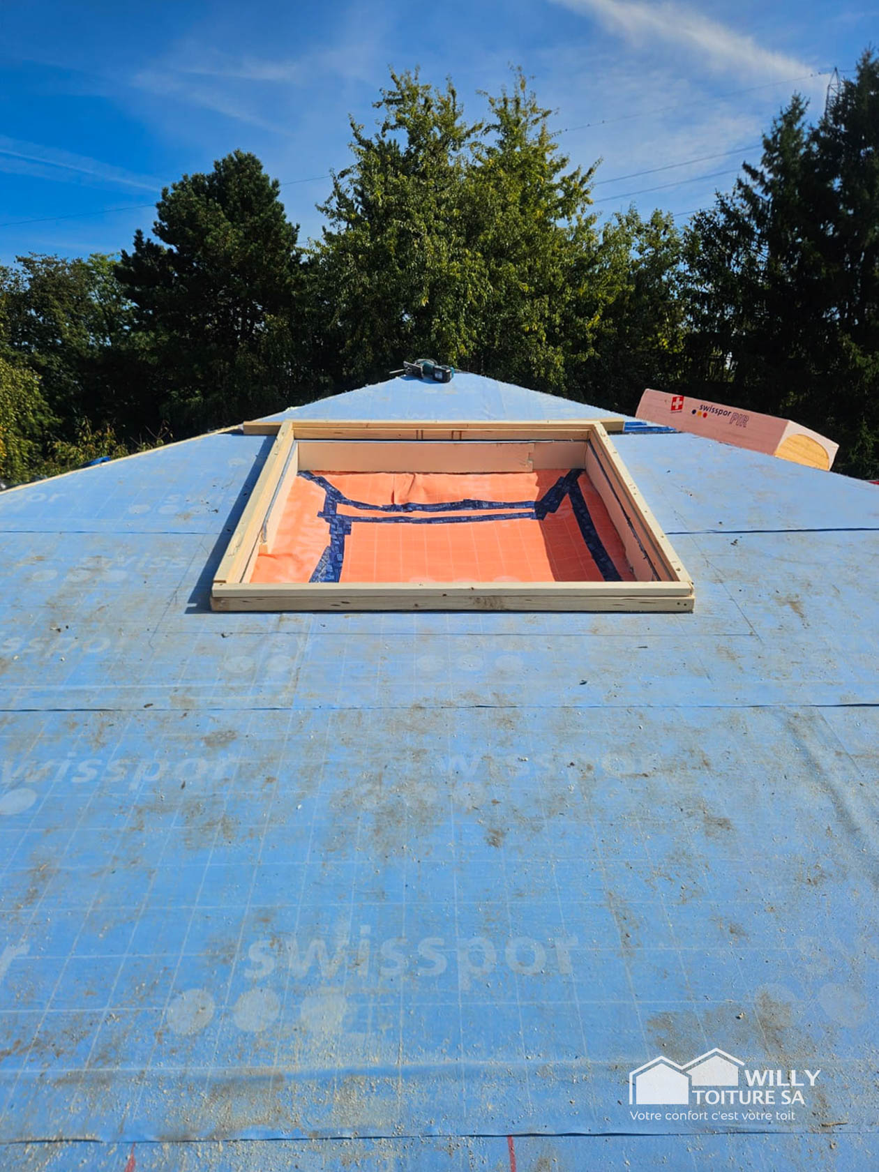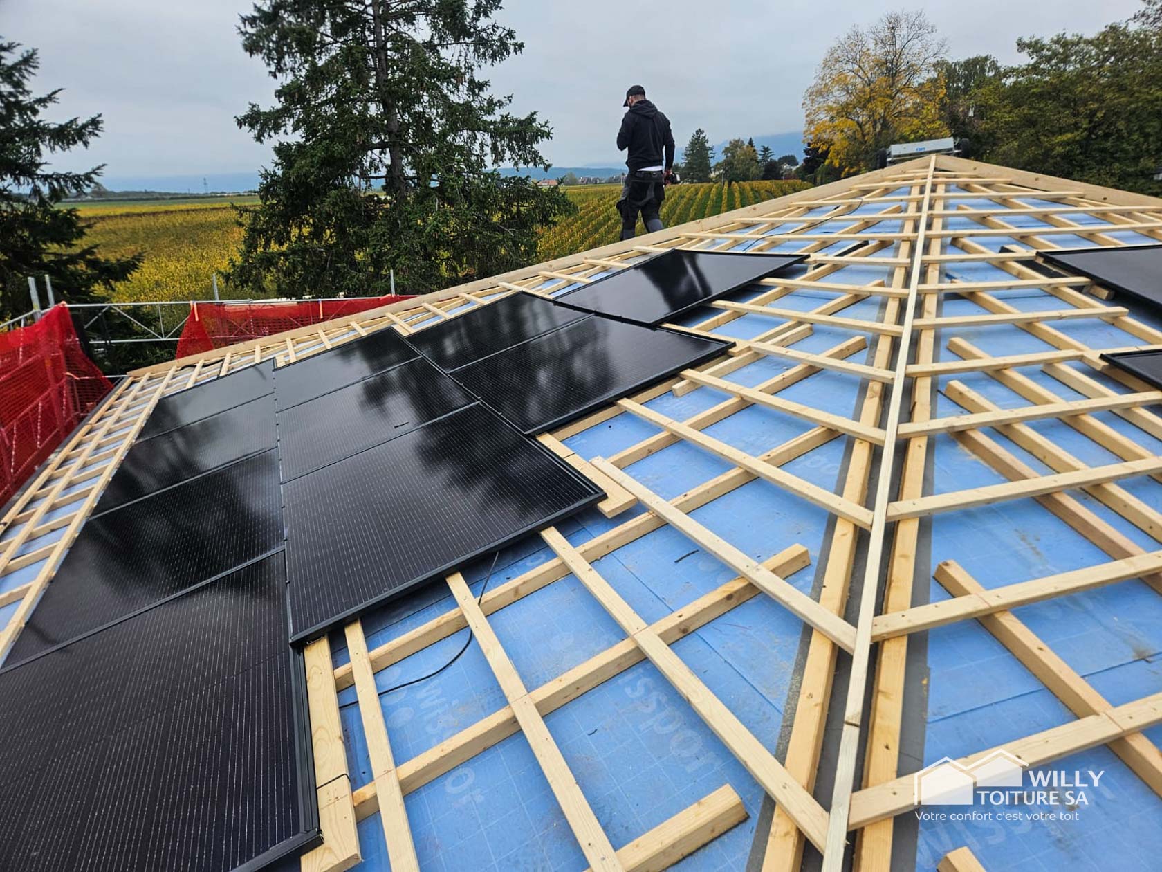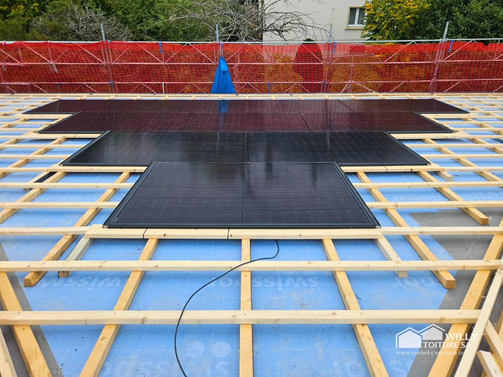 Rénovation énergétique d’une villa sise à Founex datant de 1966. Rénovation complète du toit qui était isolé entre chevrons. Une nouvelle isolation de type Swisspor sur chevrons d’une épaisseur de 140 mm a été installée à la place. De nouvelles tuiles plates mécaniques de couleur anthracite sont venues moderniser l’ensemble avec également des ferblanteries en alu anthracite.