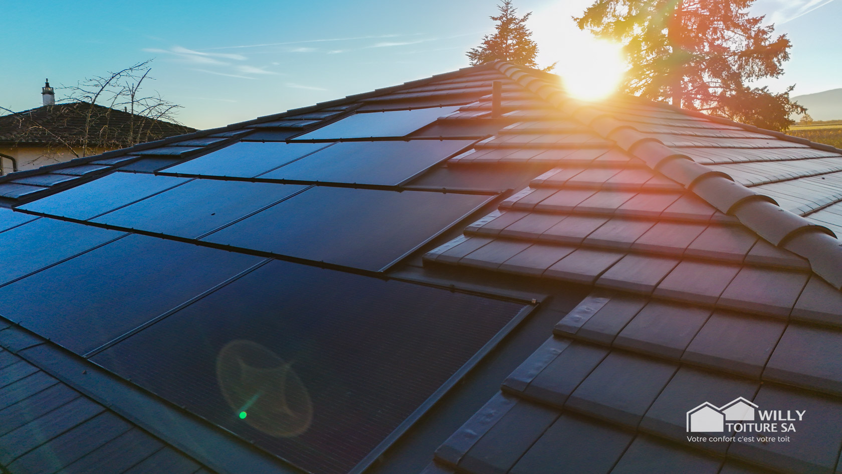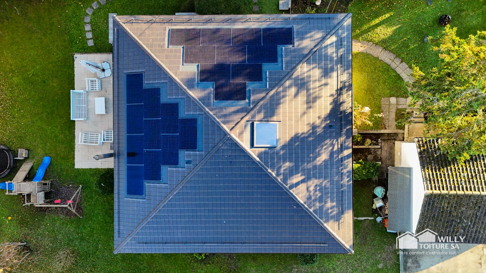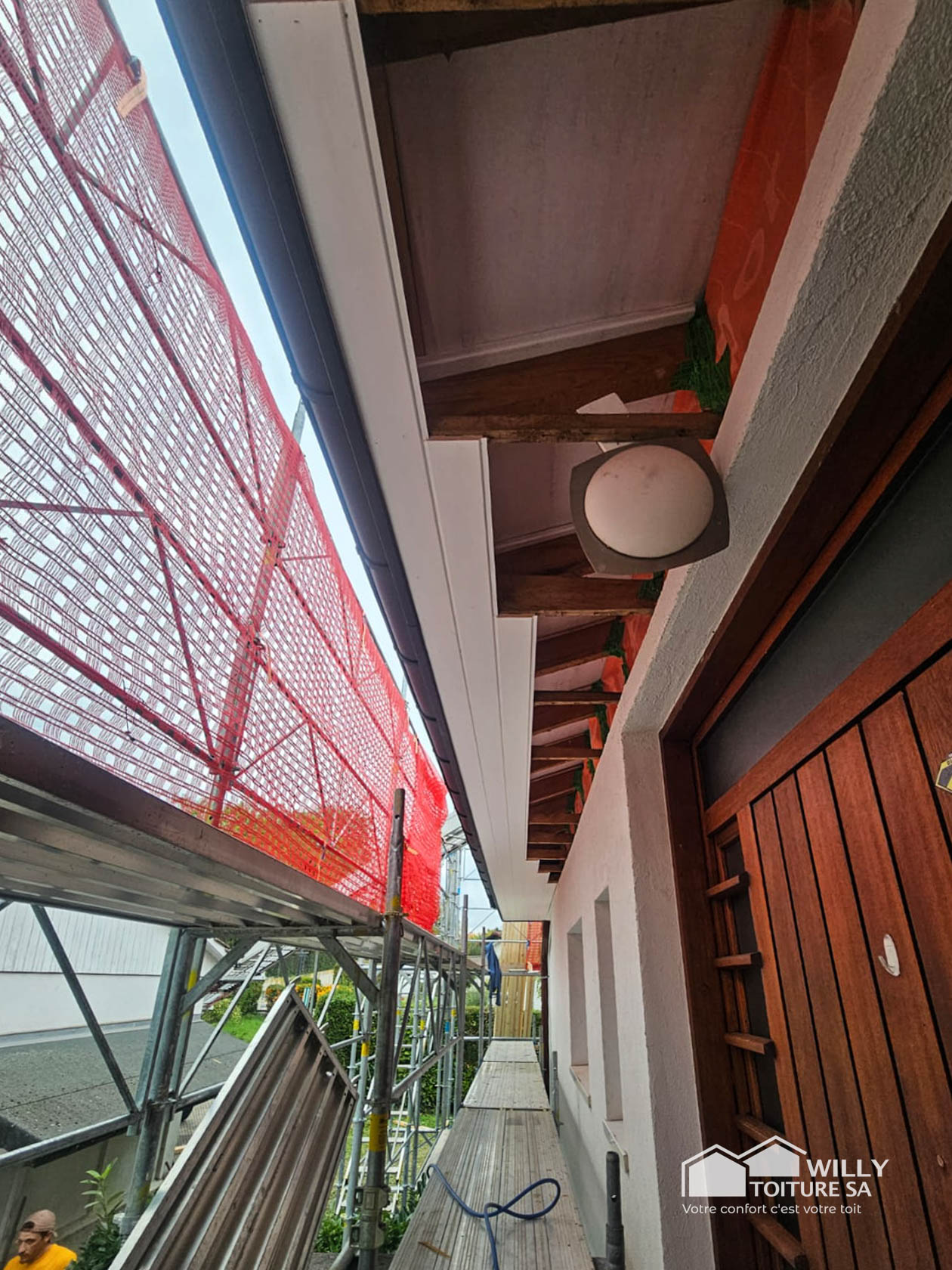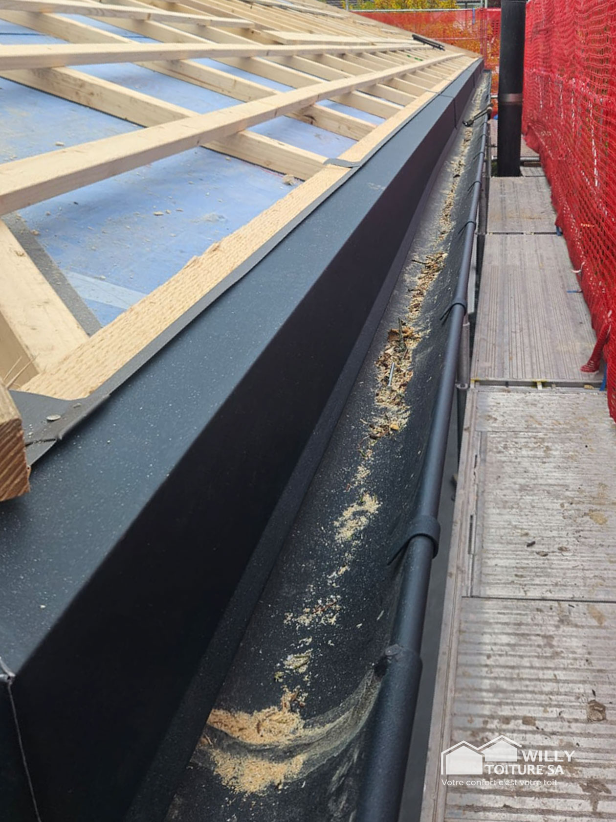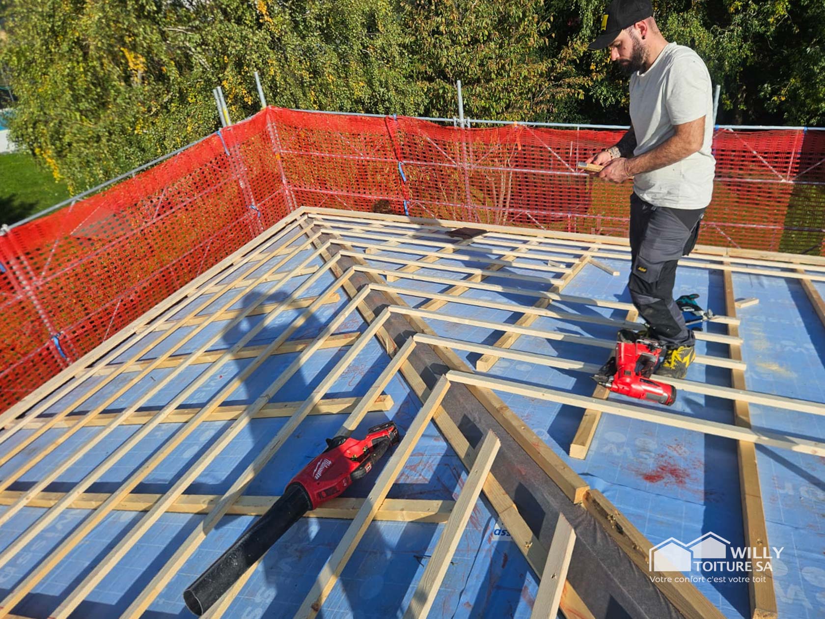 Rénovation énergétique d’une villa sise à Founex datant de 1966. Rénovation complète du toit qui était isolé entre chevrons. Une nouvelle isolation de type Swisspor sur chevrons d’une épaisseur de 140 mm a été installée à la place. De nouvelles tuiles plates mécaniques de couleur anthracite sont venues moderniser l’ensemble avec également des ferblanteries en alu anthracite.